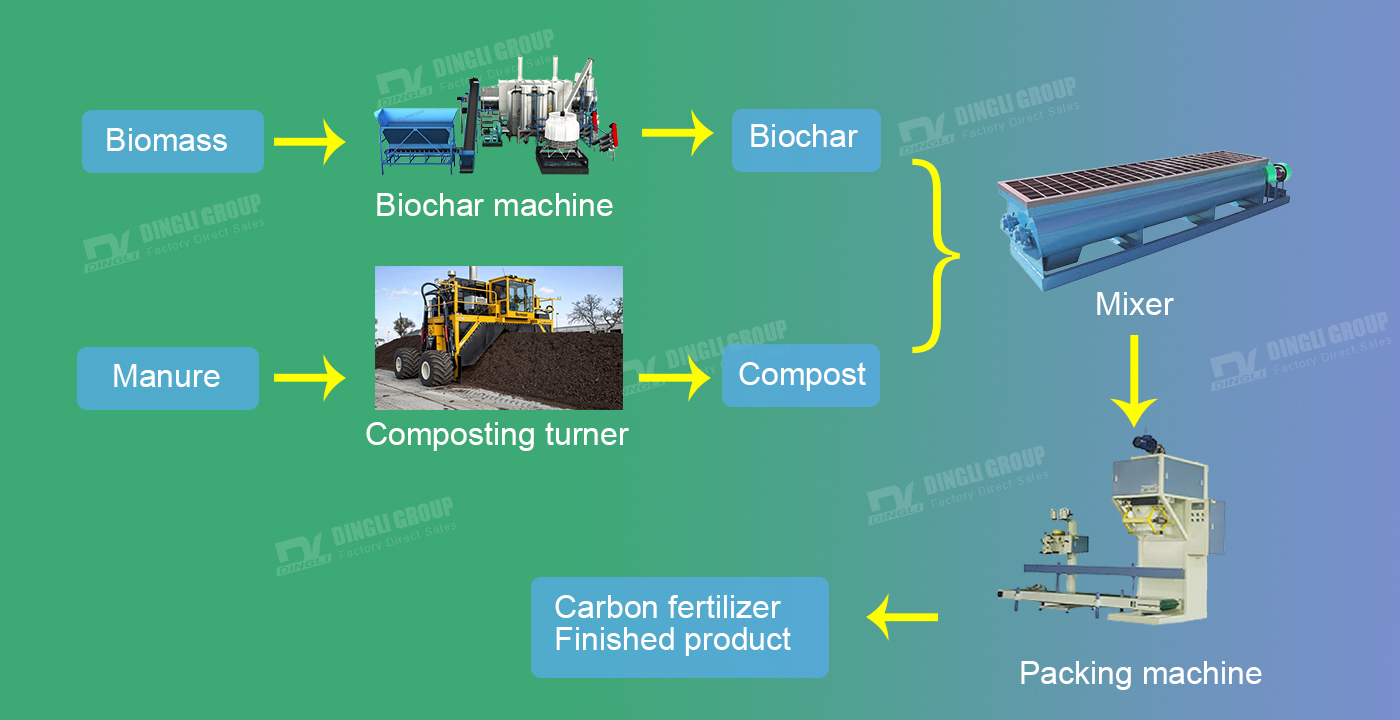 Customize machine solution according to your actual needs.This biochar-based fertilizer production line is scientifically designed and widely compatible, suitable for the co-processing and fertilizerization of various organic and biomass raw materials. The materials used are diverse, mainly including two categories: first, raw materials for biochar preparation, such as agricultural residues like rice husks, wheat straw, and corn stalks; forestry processing waste such as sawdust, wood chips, and branches; and other biomass rich in lignin, such as coconut shells, bamboo chips, and fruit shells; second, raw materials for composting fermentation, such as livestock and poultry manure like chicken, pig, and cow manure; pre-treated kitchen waste or biogas residue; and biomass waste such as distiller's grains, vinegar residue, mushroom residue, and traditional Chinese medicine residue. By co-processing these two major categories of materials, this production line enables the efficient resource utilization of agricultural, forestry, and urban/rural organic waste.